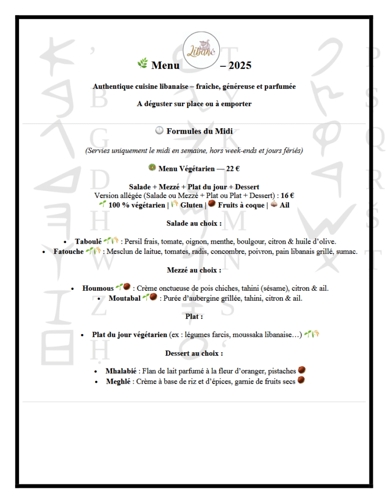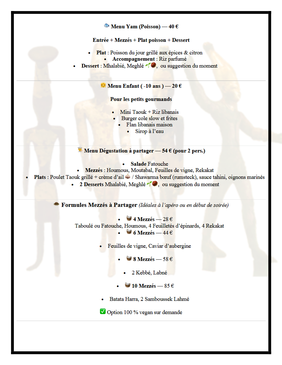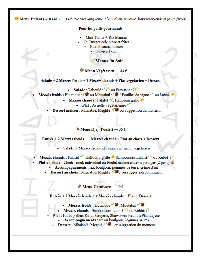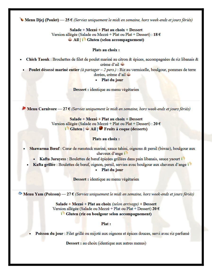 Salade (Taboulé ou Fatouch) + Mezze 1 (Houmous ou Caviar d’aubergine) + Mezze 2 (Feuilles de vignes ou Falafel) + Mezze 3 (Halloumi ou Labné) + Plat Végétarien + Dessert