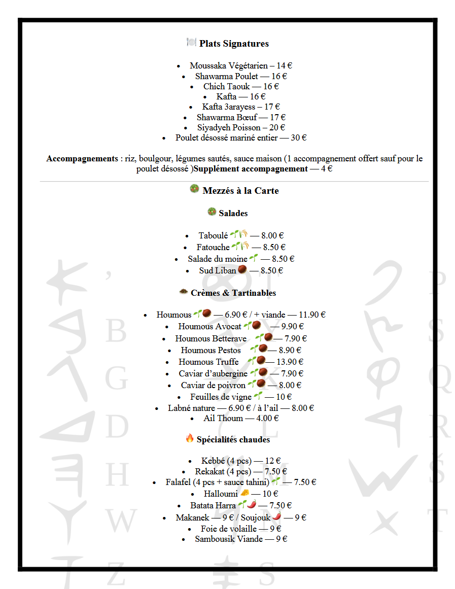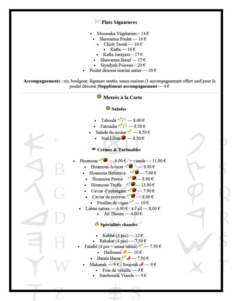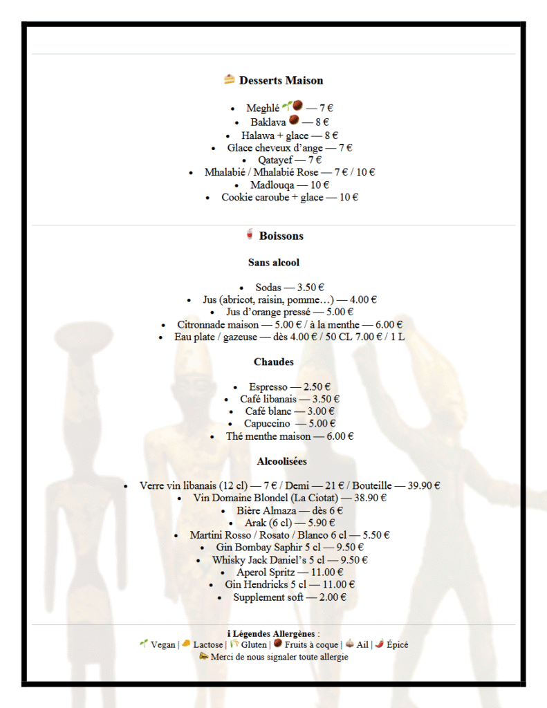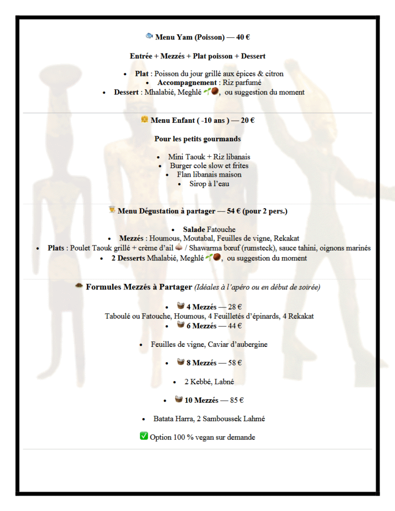 Salade (Taboulé ou Fatouch) + Mezze 1 (Houmous ou Caviar d’aubergine) + Mezze 2 (Feuilles de vignes ou Falafel) + Mezze 3 (Halloumi ou Labné) + Plat Végétarien + Dessert